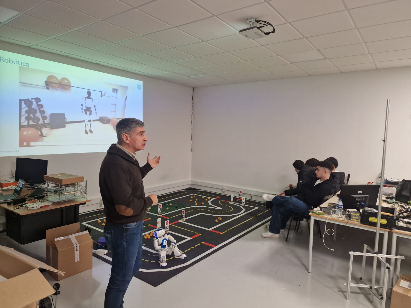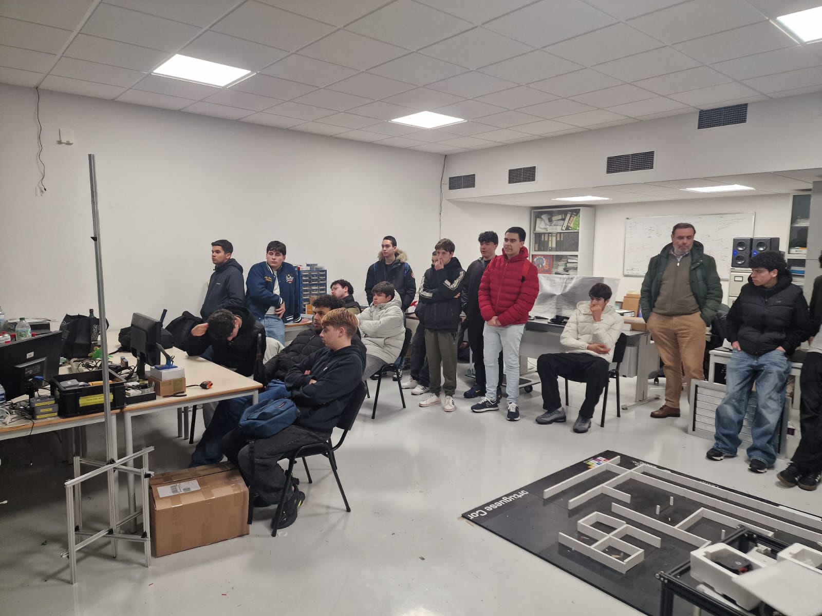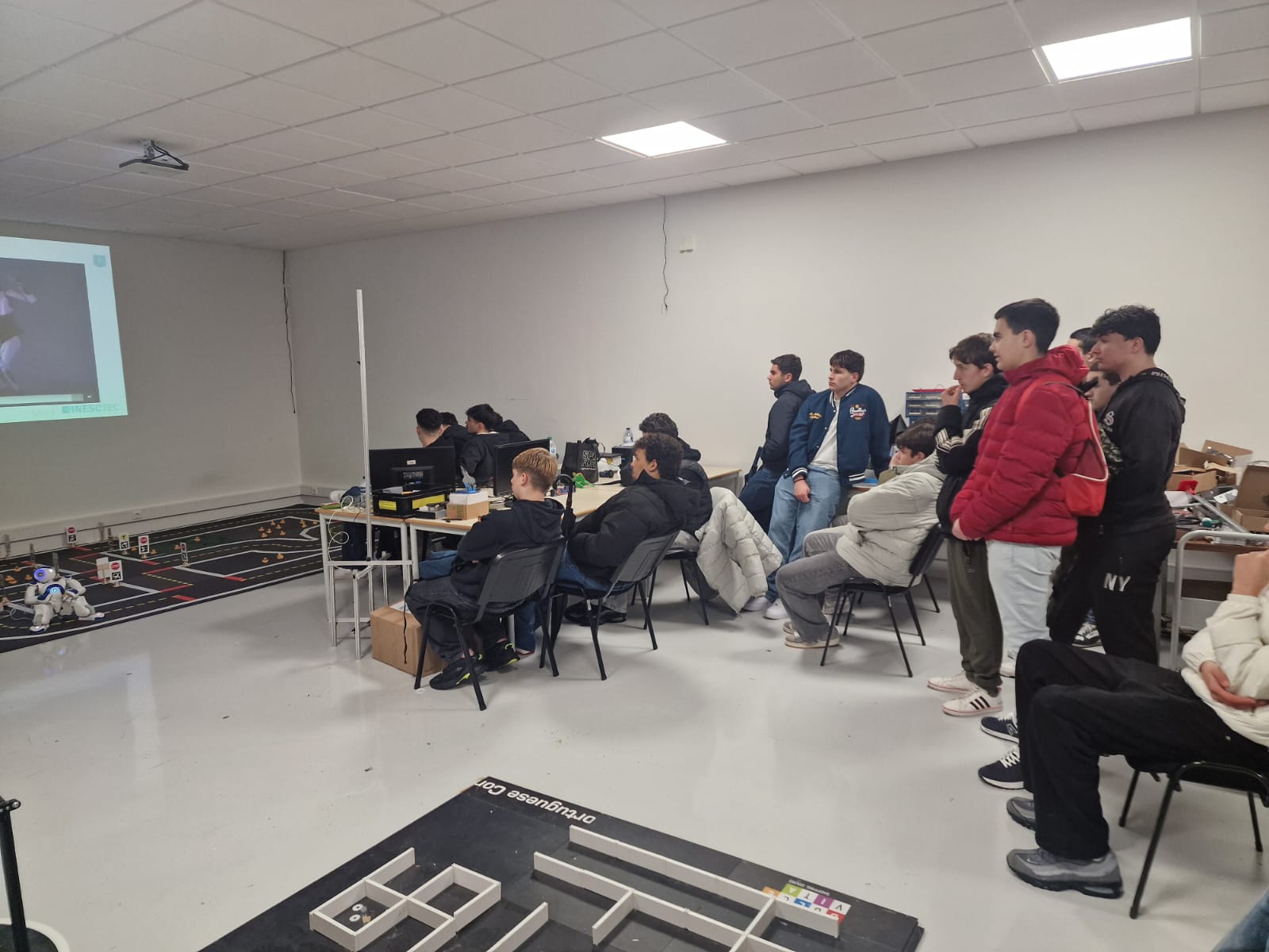 Durante a visita, os alunos conheceram os laboratórios de Engenharia Eletrotécnica e de Computadores, onde puderam observar diversos trabalhos e projetos desenvolvidos na área da robótica. Ao longo da atividade, foram apresentados exemplos práticos de sistemas robóticos, aplicações tecnológicas inovadoras e soluções desenvolvidas por estudantes e investigadores da universidade.
