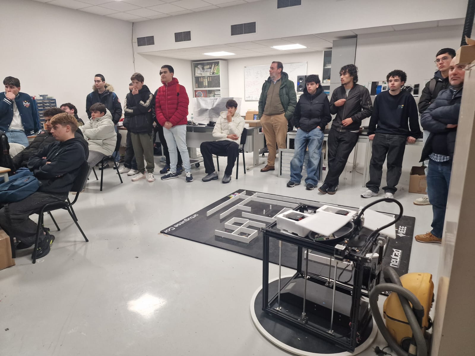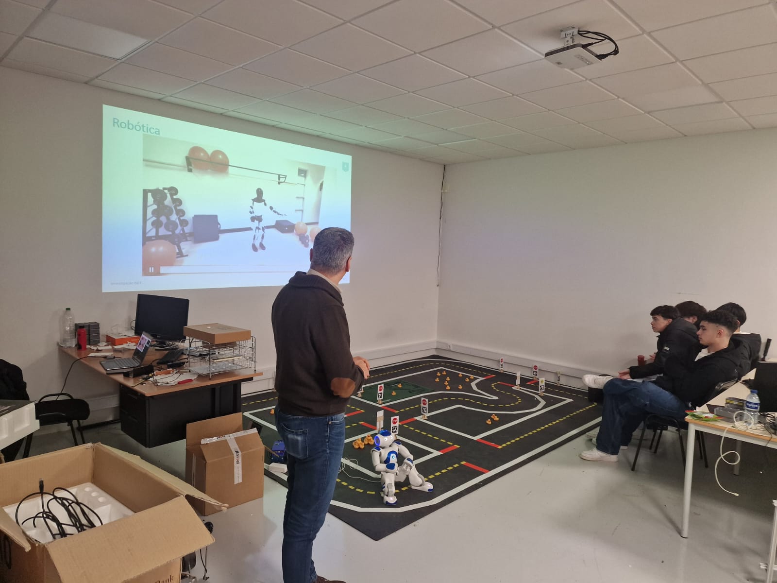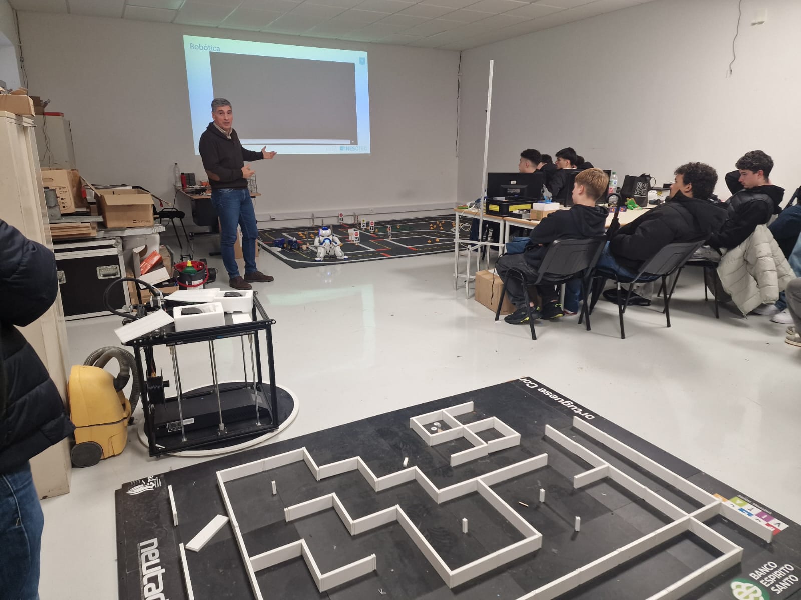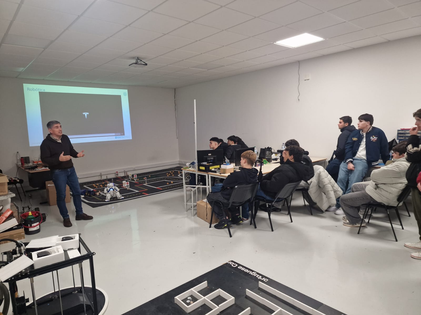 Durante a visita, os alunos conheceram os laboratórios de Engenharia Eletrotécnica e de Computadores, onde puderam observar diversos trabalhos e projetos desenvolvidos na área da robótica. Ao longo da atividade, foram apresentados exemplos práticos de sistemas robóticos, aplicações tecnológicas inovadoras e soluções desenvolvidas por estudantes e investigadores da universidade.
